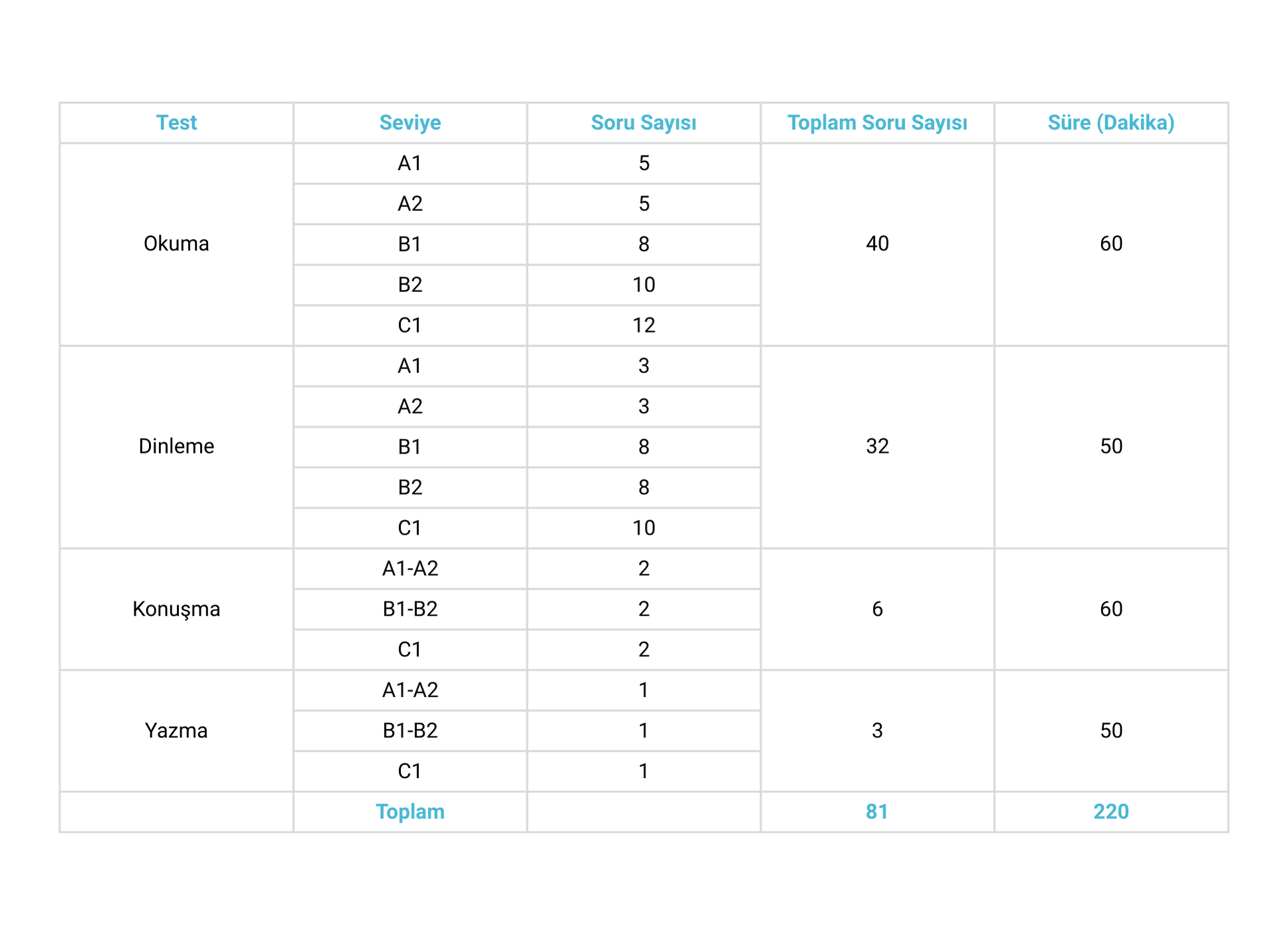 • Sınav üç oturumdan oluşmaktadır. Birinci oturumda çoktan seçmeli okuma ve dinleme testi, ikinci oturumda yazma görevleri ve üçüncü oturumda konuşma görevleri uygulanmaktadır.